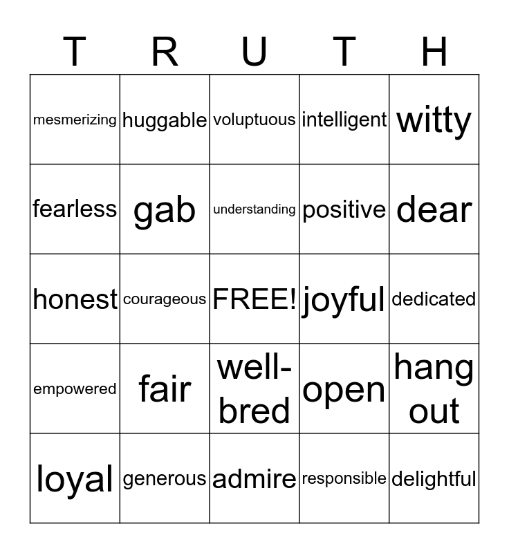 This bingo card has a free space and 377 words: uplift, understand, trust, treasure, sympathize, support, stick up for, shoulder, shop, share, seduce, satisfy, sacrifice, respect, rely on, relate to, provide, play, overcome, nurture, mother, mature, marry, love, loudmouth, listen, lift spirits, learn, lean on, laugh with, laugh, know, kiss, keep secrets, keep promises, keep company, juggle, inspire, identify with, hug, help, hang out, guide, gossip, give birth to, give advice, give, giggle, gab, forgive, flirt, flatter, feel, express, escort, entrust, enjoy, encourage, enchant, dote, develop, depend, dazzle, court, count on, counsel, connect with, confide in, communicate, comfort, cherish, cheer on, chat, charm, care about, captivate, brighten, believe in, befriend, attract, assure, assist, appreciate, agree with, advise, adore, admire, accept, youthful, young, wonderful, womanly, witty, wise, wily, willing, well-read, well-mannered, well-educated, well-bred, warm-hearted, warm, vunerable, voluptuous, virtuous, valued, upbeat, unpretentious, unique, understanding, unconventional, unafraid, trustworthy, trusting, tough, thriving, thoughtful, thorough, thin, thick-skinned, thankful, tender-hearted, tawny, tasteful, talkative, talented, sympathetic, sweet, supple, sultry, successful, strong-willed, strong, spunky, spontaneous, spirited, special, sophisticated, soft-spoken, soft, social, smiling, smiley, smart, skinny, shy, shrewd, sharp, sexy, sexual, serious, sensual, sensitive, sensical, selfless, self-driven, self-confident, selective, seductive, sassy, sacrificing, romantic, responsible, respectful, reserved, remarkable, refined, red hot, rebellious, ravishing, radiant, quirky, quiet, quick-witted, punctual, provocative, proud, private, principled, pretty, precious, pragmatic, powerful, positive, popular, polite, poetic, playful, photogenic, philanthropic, petite, personable, persistent, perfect, perceptive, patient, passionate, outgoing, organized, opinionated, open-minded, open, offbeat, observant, nurturing, nice, natural, mysterious, musical, motivated, mischievous, mesmerizing, mature, matronly, magnetic, luscious, loyal, loving, lovely, loved, lovable, likable, leggy, laid-back, ladylike, knowledgeable, knowing, kissable, kind-hearted, kind, joyful, irreplaceable, intuitive, intoxicating, intimate, intelligent, intellectual, inspiring, inspirational, innovative, innocent, independent, impulsive, impassioned, idolized, hypnotic, huggable, hot, honest, hilarious, high-energy, helpful, heavenly, healthy, hard-working, happy, grounded, graceful, gorgeous, good-natured, goal-oriented, glamorous, giving, girly, giggly, gifted, giddy, genuine, gentle, generous, funny, fun-loving, fun, friendly, frail, fragile, foxy, forgiving, focused, flirty, flirtatious, flawless, fit, fiery, feminine, female, feisty, fearless, fashionable, fair, fabulous, extraordinary, expressive, etherial, entertaining, enigmatic, engaging, energetic, encouraging, enchanting, empowered, emotional, elegant, easy-going, dynamic, dreamy, dreaming, dramatic, down-to-earth, doting, disciplined, devout, devoted, determined, detail-oriented, dependable, delightful, delicate, dedicated, dear, dazzling, darling, daring, dainty, cute, curvy, curious, cultured, cuddly, creative, crafty, courageous, content, considerate, confident, complex, compassionate, committed, clever, classy, cheerful, cheeky, charming, caring, careful, captivating, candid, calm, buxom, busty, bubbly, brilliant, bright, breathtaking, brave, blessed, bewitching, beloved, beautiful, attractive, attentive, athletic, artsy, artistic, appreciative, appreciated, angelic, ambitious, amazing, alluring, all-American, agreeable, affectionate, adventurous, adorable, active and accepting.