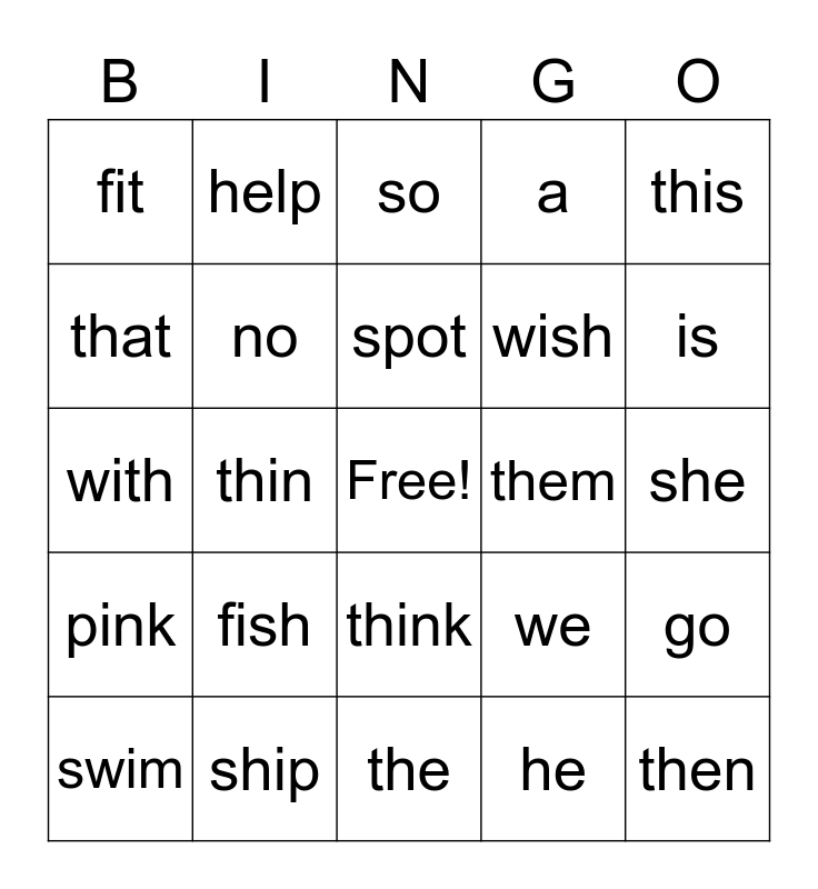 This bingo card has a free space and 24 words: fish, ship, spot, swim, this, fit, that, help, them, think, wish, with, we, go, no, he, she, so, is, thin, then, pink, a and the.