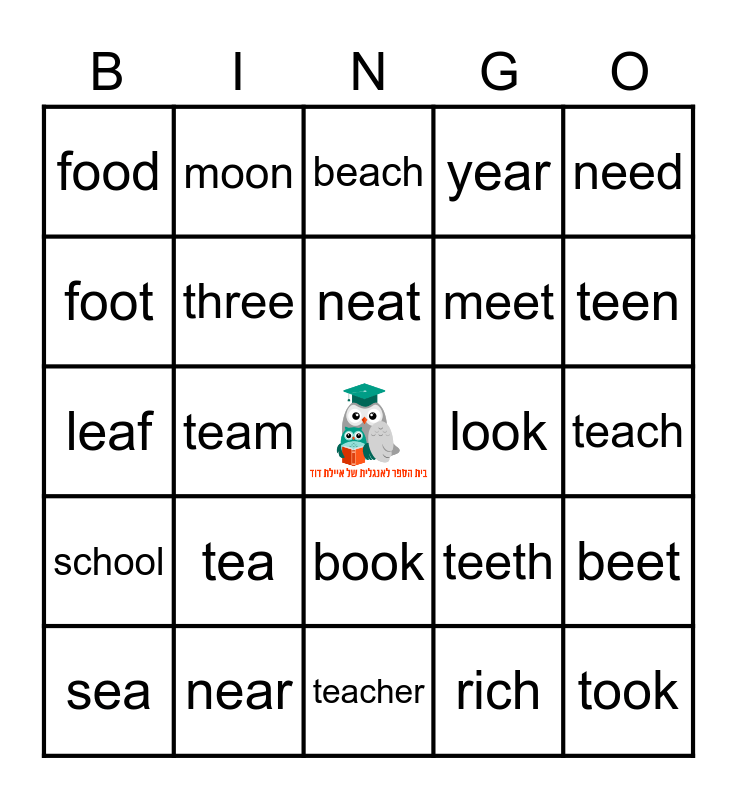 This bingo card has a free space and 24 words: tea, near, neat, sea, need, food, foot, moon, look, book, meet, leaf, teeth, beet, three, rich, teach, beach, teen, team, took, school, year and teacher.