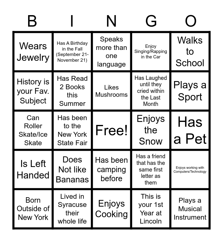 This bingo card has a free space and 24 words: Born Outside of New York, Does Not like Bananas, Likes Mushrooms, This is your 1st Year at Lincoln, Walks to School, Wears Jewelry, Has A Birthday in the Fall (September 21-November 21), Speaks more than one language, Enjoys the Snow, Has a Pet, Can Roller Skate/Ice Skate, Has Read 2 Books this Summer, Has a friend that has the same first letter as them, Enjoys working with Computers/Technology, History is your Fav. Subject, Lived in Syracuse their whole life, Enjoys Cooking, Enjoy Singing/Rapping in the Car, Plays a Sport, Is Left Handed, Has been to the New York State Fair, Has been camping before, Has Laughed until they cried within the Last Month and Plays a Musical Instrument.