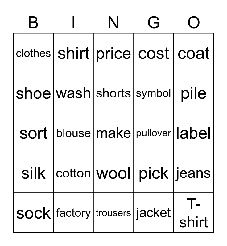 This bingo card has 25 words: cotton, trousers, shorts, sock, coat, clothes, shoe, shirt, pullover, wool, symbol, sort, pick, jeans, wash, T-shirt, label, price, pile, blouse, make, factory, silk, cost and jacket.