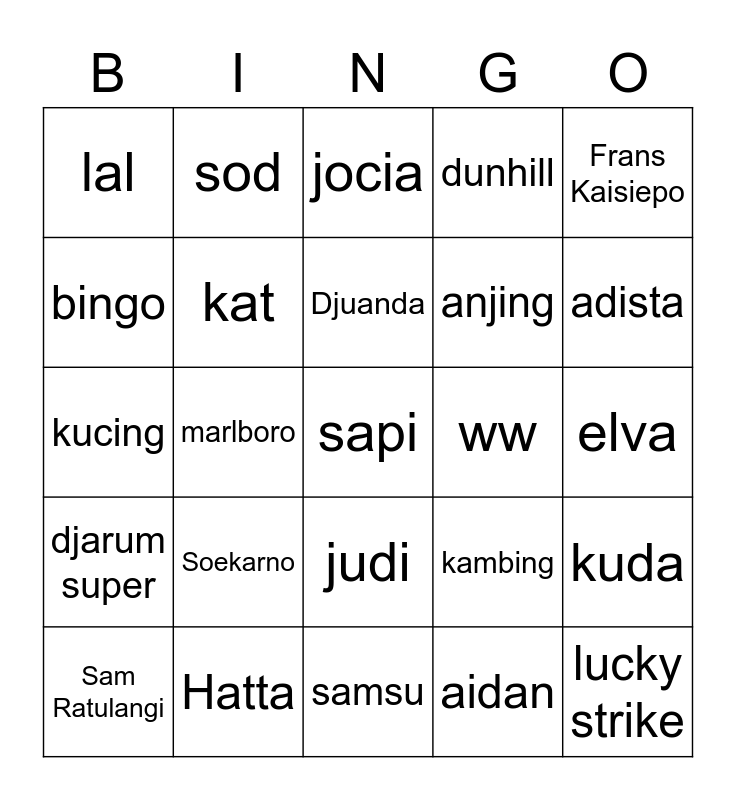 This bingo card has a free space and 24 words: Soekarno, Hatta, Djuanda, Sam Ratulangi, Frans Kaisiepo, lal, bingo, sod, ww, judi, anjing, kucing, kambing, kuda, kat, aidan, elva, jocia, adista, marlboro, lucky strike, djarum super, dunhill and samsu.