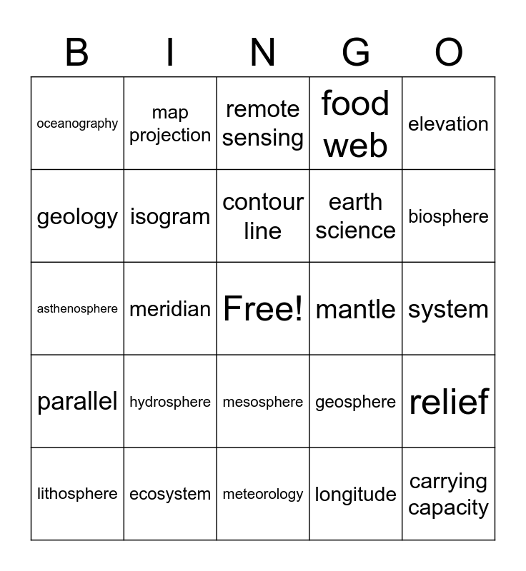 This bingo card has a free space and 32 words: longitude, topography, meridian, scale, parallel, isogram, elevation, relief, map projection, latitude, contour line, remote sensing, legend, crust, mantle, core, lithosphere, asthenosphere, mesosphere, hydrosphere, geosphere, atmosphere, system, ecosystem, carrying capacity, food web, earth science, geology, oceanography, meteorology, astronomy and biosphere.