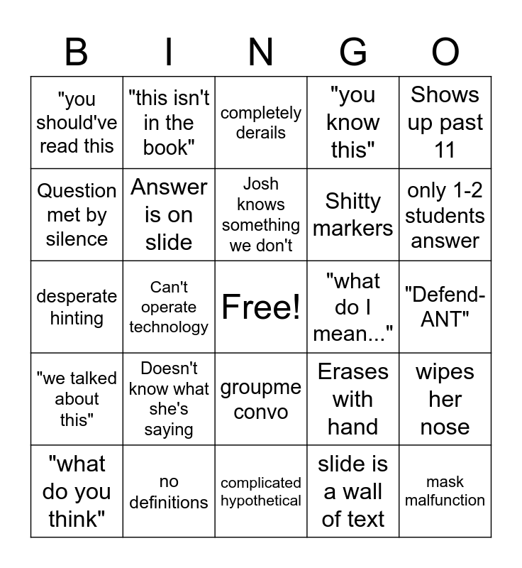 This bingo card has a free space and 24 words: Doesn't know what she's saying, no definitions, Josh knows something we don't, "what do you think", Shows up past 11, "you should've read this, Question met by silence, "this isn't in the book", "what do I mean...", groupme convo, Shitty markers, desperate hinting, Erases with hand, wipes her nose, Answer is on slide, slide is a wall of text, "Defend-ANT", completely derails, only 1-2 students answer, Can't operate technology, mask malfunction, "we talked about this", "you know this" and complicated hypothetical.