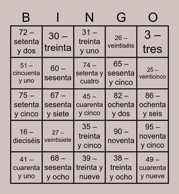 This bingo card has 101 words: 1 – uno, 2 – dos, 3 – tres, 4 – cuatro, 5 – cinco, 6 – seis, 7 – siete, 8 – ocho, 9 – nueve, 10 – diez, 11 – once, 12 – doce, Free!, 13 – trece, 14 – catorce, 15 – quince, 16 – dieciséis, 17 – diecisiete, 18 – dieciocho, 19 – diecinueve, 20 – veinte, 21 – veintiuno, 22 – veintidós, 23 – veintitrés, 24 – veinticuatro, 25 – veinticinco, 26 – veintiséis, 27 – veintisiete, 28 – veintiocho, 29 – veintinueve, 30 – treinta, 31 – treinta y uno, 32 – treinta y dos, 33 – treinta y tres, 34 – treinta y cuatro, 35 – treinta y cinco, 36 – treinta y seis, 37 – treinta y siete, 38 – treinta y ocho, 39 – treinta y nueve, 40 – cuarenta, 41 – cuarenta y uno, 42 – cuarenta y dos, 43 – cuarenta y tres, 44 – cuarenta y cuatro, 45 – cuarenta y cinco, 46 – cuarenta y seis, 47 – cuarenta y siete, 48 – cuarenta y ocho, 49 – cuarenta y nueve, 50 – cincuenta, 51 – cincuenta y uno, 52 – cincuenta y dos, 53 – cincuenta y tres, 54 – cincuenta y cuatro, 55 – cincuenta y cinco, 56 – cincuenta y seis, 57 – cincuenta y siete, 58 – cincuenta y ocho, 59 – cincuenta y nueve, 60 – sesenta, 61 – sesenta y uno, 62 – sesenta y dos, 63 – sesenta y tres, 64 – sesenta y cuatro, 65 – sesenta y cinco, 66 – sesenta y seis, 67 – sesenta y siete, 68 – sesenta y ocho, 69 – sesenta y nueve, 70 – setenta, 71 – setenta y uno, 72 – setenta y dos, 73 – setenta y tres, 74 – setenta y cuatro, 75 – setenta y cinco, 76 – setenta y seis, 77 – setenta y siete, 78 – setenta y ocho, 79 – setenta y nueve, 80 – ochenta, 81 – ochenta y uno, 82 – ochenta y dos, 83 – ochenta y tres, 84 – ochenta y cuatro, 85 – ochenta y cinco, 86 – ochenta y seis, 87 – ochenta y siete, 88 – ochenta y ocho, 89 – ochenta y nueve, 90 – noventa, 91 – noventa y uno, 92 – noventa y dos, 93 – noventa y tres, 94 – noventa y cuatro, 95 – noventa y cinco, 96 – noventa y seis, 97 – noventa y siete, 98 – noventa y ocho, 99 – noventa y nueve and 100 – cien.