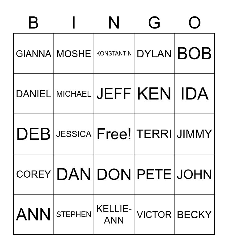This bingo card has a free space and 27 words: PETE, ISSAC, KEN, KELLIE-ANN, DANIEL, KONSTANTIN, MOSHE, COREY, TERRI, JOHN, DEB, DYLAN, ANN, STEPHEN, IDA, PATRICK, MICHAEL, JEFF, DAN, GIANNA, JIMMY, VICTOR, JESSICA, BECKY, DON, BOB and TERRY.
