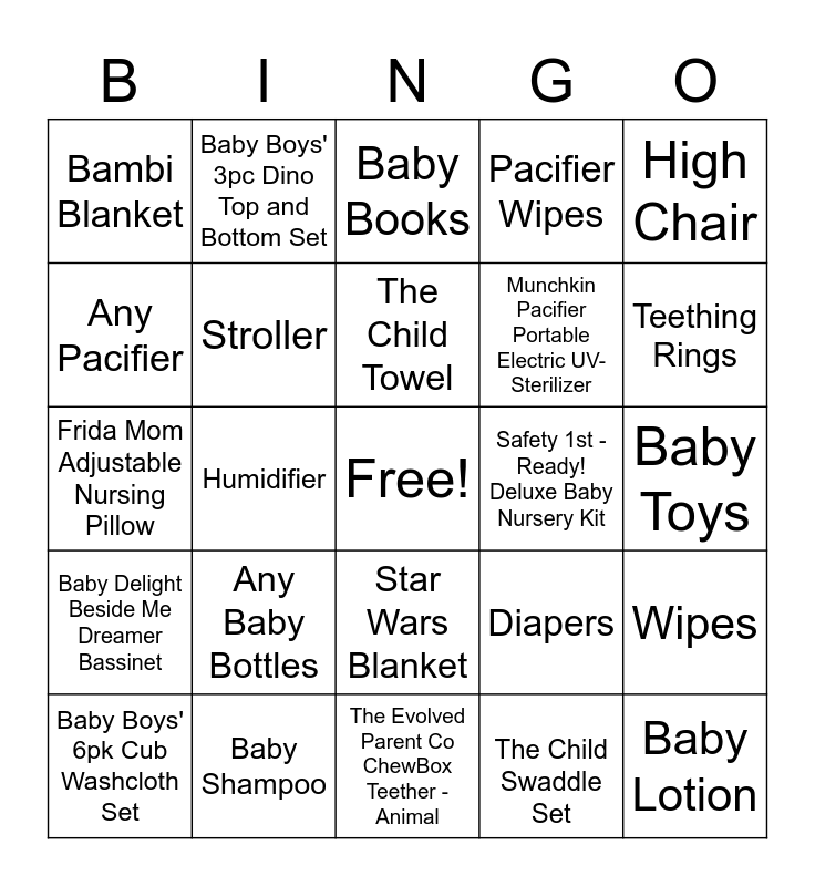 This bingo card has a free space and 25 words: Any Baby Bottles, The Evolved Parent Co ChewBox Teether - Animal, The Child Towel, Baby Boys' 6pk Cub Washcloth Set, High Chair, Bambi Blanket, Any Pacifier, Baby Boys' 3pc Dino Top and Bottom Set, Safety 1st - Ready! Deluxe Baby Nursery Kit, Star Wars Blanket, Munchkin Pacifier Portable Electric UV-Sterilizer, Frida Mom Adjustable Nursing Pillow, Diapers, Wipes, Stroller, Baby Hats, Baby Toys, Baby Books, Teething Rings, Humidifier, Baby Lotion, Baby Shampoo, Baby Delight Beside Me Dreamer Bassinet, Pacifier Wipes and The Child Swaddle Set.