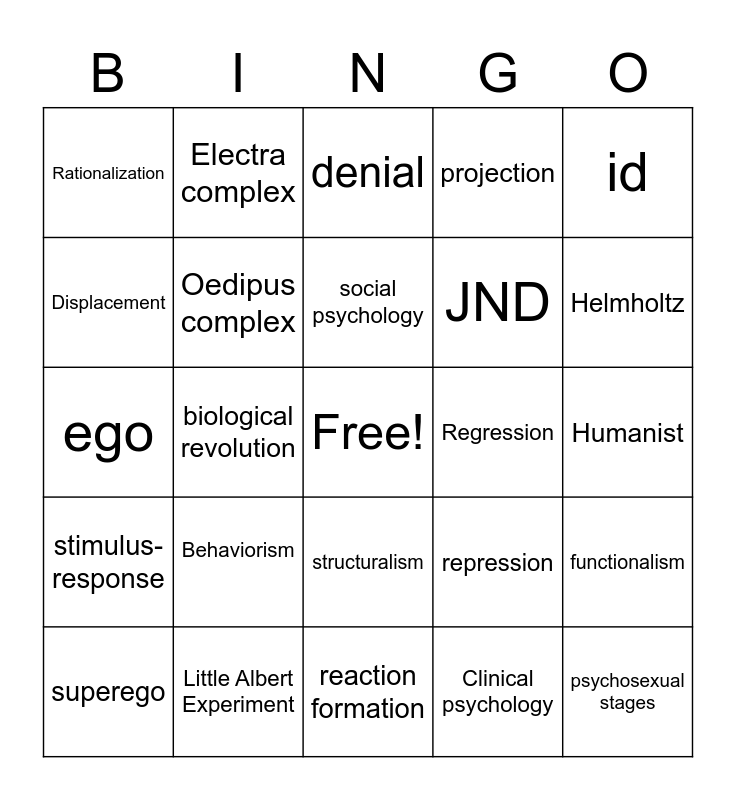 This bingo card has a free space and 24 words: Behaviorism, Little Albert Experiment, social psychology, superego, id, Rationalization, Displacement, Electra complex, Regression, structuralism, JND, ego, repression, functionalism, Oedipus complex, Clinical psychology, Humanist, denial, Helmholtz, biological revolution, psychosexual stages, stimulus-response, projection and reaction formation.