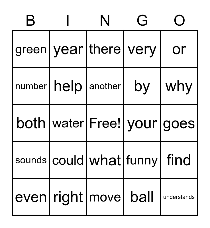 This bingo card has a free space and 24 words: could, right, another, even, or, green, number, year, your, what, by, both, funny, find, help, ball, goes, there, why, water, understands, sounds, very and move.