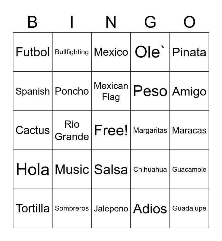 This bingo card has a free space and 29 words: Tortilla, Fiesta, Rio Grande, Mariachi, Futbol, Mexico, Poncho, Music, Margaritas, Sombreros, Maracas, Guadalupe, Jalepeno, Adios, Amigo, Taco, Salsa, Hola, Pinata, Cactus, Chihuahua, Corona, Peso, Spanish, Ole`, Bullfighting, Guacamole, Mexican Flag and Poncho.