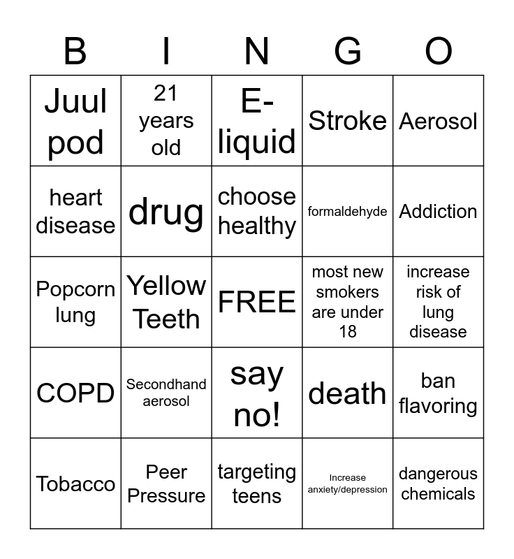 This bingo card has a free space and 29 words: Tobacco, Nicotine, Yellow Teeth, throat cancer, Juul pod, E-liquid, drug, Secondhand aerosol, most new smokers are under 18, Peer Pressure, increase risk of lung disease, dangerous chemicals, targeting teens, Increase anxiety/depression, Addiction, shortness of breath, say no!, COPD, Aerosol, Popcorn lung, death, Alters the brain, formaldehyde, heart disease, Stroke, 21 years old, ban flavoring, choose healthy and Stricter regulations.
