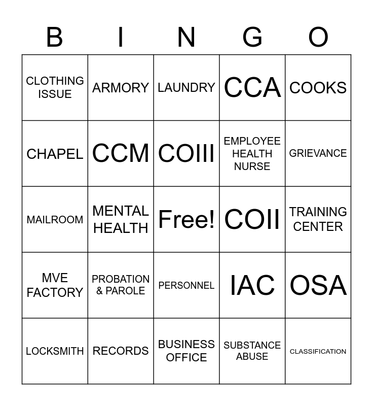 This bingo card has a free space and 50 words: ADMINISTRATION, CLASSIFICATION, CUSTODY, BUSINESS OFFICE, PROBATION & PAROLE, ACADEMIC EDUCATION, ARMORY, CANTEEN, CHAPEL, FUM, CCM, CCA, OSA, IAC, CSII, CSI, COIII, COII, COI, COOKS, MENTAL HEALTH, SUBSTANCE ABUSE, CLOTHING ISSUE, EMPLOYEE HEALTH NURSE, FIRE & SAFETY, FOOD SERVICE, GRIEVANCE, INVESTIGATORS, LAUNDRY, PERSONNEL, POWER HOUSE, PROPERTY, SALLY PORT, RECEIVING & ORIENTATION, RECORDS, RECREATION, RECRUITING, SEARCH POINT, SWITCHBOARD, TRAINING CENTER, VISITING, VOCATIONAL EDUCATION, WAREHOUSE, LIBRARY, LOCKSMITH, MAILROOM, MAINTENANCE, MEDICAL, MVE FACTORY and PATCH.