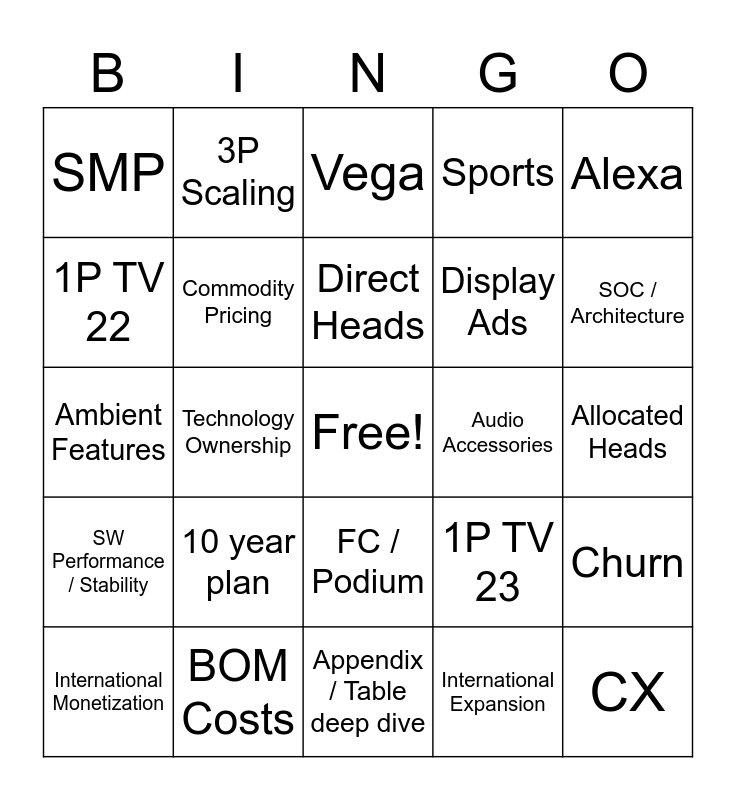 This bingo card has a free space and 24 words: 10 year plan, BOM Costs, Direct Heads, International Monetization, Alexa, SMP, 1P TV 22, 3P Scaling, Audio Accessories, FC / Podium, Display Ads, Ambient Features, 1P TV 23, Churn, Commodity Pricing, International Expansion, Allocated Heads, Vega, SOC / Architecture, Technology Ownership, CX, SW Performance / Stability, Sports and Appendix / Table deep dive.