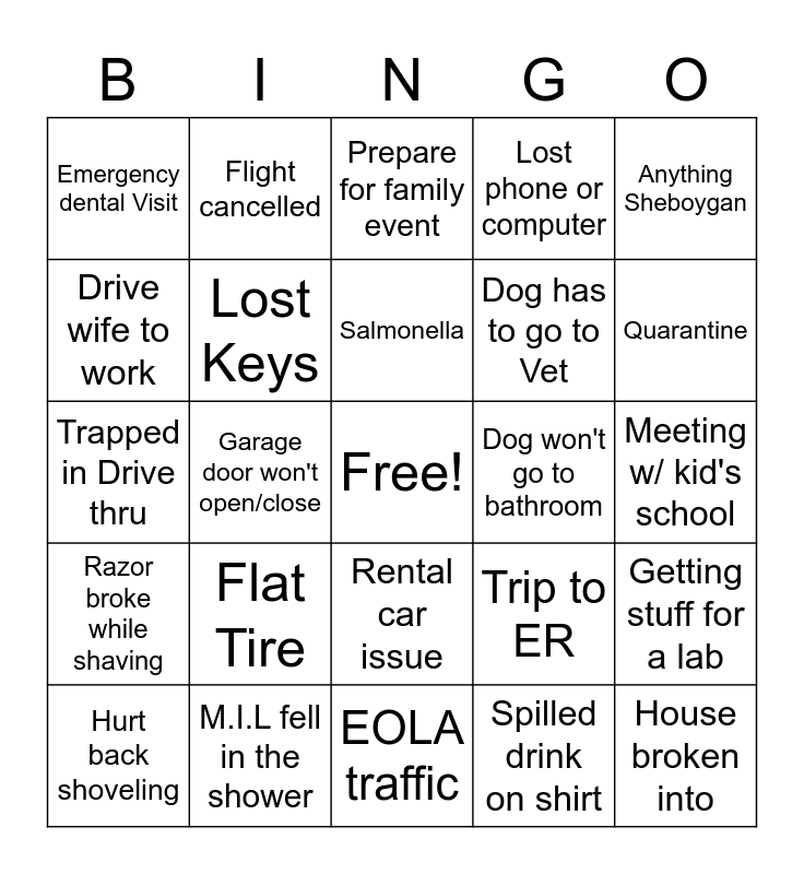 This bingo card has a free space and 24 words: Flat Tire, M.I.L fell in the shower, Salmonella, Hurt back shoveling, Anything Sheboygan, Emergency dental Visit, Drive wife to work, Flight cancelled, Dog won't go to bathroom, Rental car issue, Dog has to go to Vet, Trapped in Drive thru, Trip to ER, Getting stuff for a lab, Lost Keys, Spilled drink on shirt, Meeting w/ kid's school, Prepare for family event, Quarantine, Garage door won't open/close, House broken into, Razor broke while shaving, Lost phone or computer and EOLA traffic.