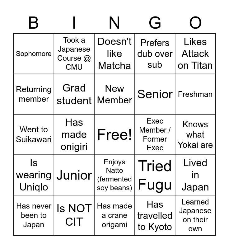 This bingo card has a free space and 24 words: Junior, Is NOT CIT, New Member, Has never been to Japan, Likes Attack on Titan, Sophomore, Returning member, Took a Japanese Course @ CMU, Exec Member / Former Exec, Enjoys Natto (fermented soy beans), Senior, Went to Suikawari, Tried Fugu, Lived in Japan, Grad student, Has travelled to Kyoto, Knows what Yokai are, Doesn't like Matcha, Freshman, Has made onigiri, Learned Japanese on their own, Is wearing Uniqlo, Prefers dub over sub and Has made a crane origami.