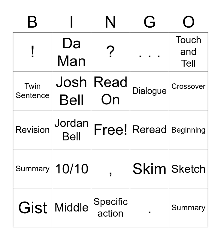 This bingo card has a free space and 24 words: 10/10, Middle, Read On, Gist, Touch and Tell, !, Twin Sentence, Da Man, Reread, ,, Dialogue, Revision, Skim, Sketch, Josh Bell, ., Beginning, ?, Crossover, Jordan Bell, Summary, Summary, . . . and Specific action.