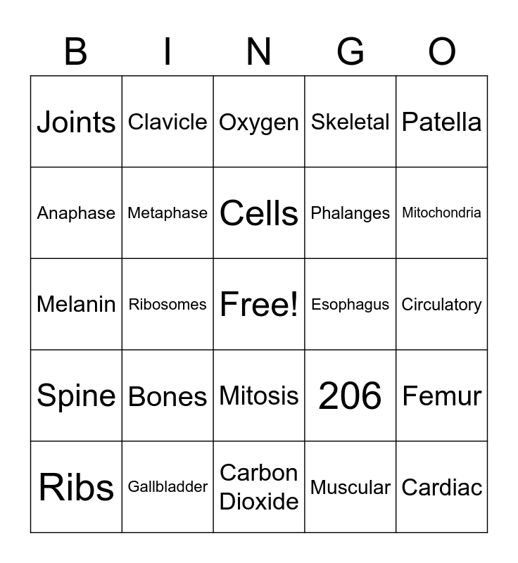 This bingo card has a free space and 44 words: Immune, Cardiac, Liver, Ribs, Cancer, Muscular, Oxygen, Heart, Patella, Gallbladder, Skeletal, Esophagus, Mitosis, Bones, Prophase, Carbon Dioxide, Infectious, Melanin, Nucleus, Mitochondria, Clavicle, Telophase, Water, Joints, White Blood Cells, Circulatory, Digestive, Brain, 206, Spine, DNA, Femur, Humerus, Salivary, Ribosomes, Sun, Cartilage, Blood Pressure, Cells, Anaphase, Phalanges, Flu, Metaphase and Calcium.