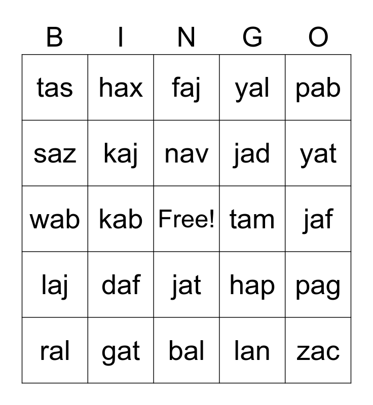 This bingo card has a free space and 24 words: daf, gat, nav, ral, pab, tas, saz, hax, tam, jat, jad, wab, hap, pag, kaj, lan, jaf, faj, yat, kab, zac, laj, yal and bal.