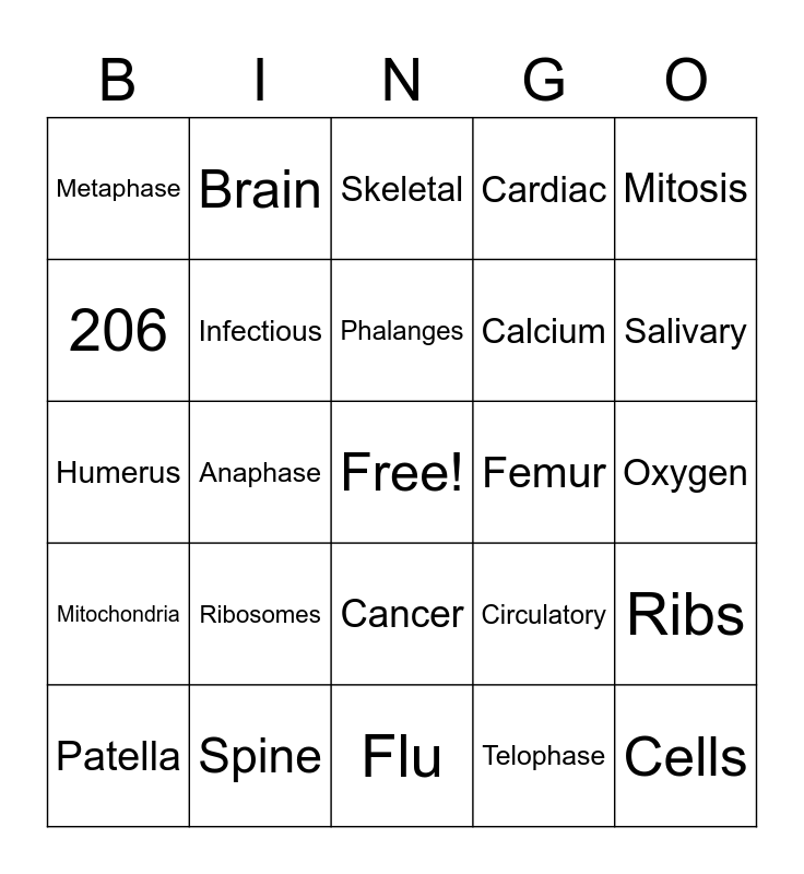 This bingo card has a free space and 44 words: Muscular, Cells, DNA, Patella, Nucleus, Telophase, Skeletal, Heart, Mitosis, Spine, Cardiac, Femur, Cancer, Ribosomes, Esophagus, Flu, Bones, Humerus, Liver, Salivary, Brain, Water, Gallbladder, Metaphase, Joints, Oxygen, Blood Pressure, Immune, Circulatory, Mitochondria, Digestive, Ribs, White Blood Cells, Prophase, Anaphase, Clavicle, Melanin, Carbon Dioxide, Phalanges, 206, Calcium, Sun, Infectious and Cartilage.