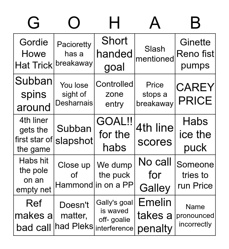 This bingo card has a free space and 24 words: Close up of Hammond, Doesn't matter, had Pleks, Controlled zone entry, Ref makes a bad call, Ginette Reno fist pumps, Gordie Howe Hat Trick, Subban spins around, Pacioretty has a breakaway, 4th line scores, We dump the puck in on a PP, Price stops a breakaway, 4th liner gets the first star of the game, No call for Galley, Someone tries to run Price, You lose sight of Desharnais, Emelin takes a penalty, Habs ice the puck, Short handed goal, CAREY PRICE, Subban slapshot, Name pronounced incorrectly, Habs hit the pole on an empty net, Slash mentioned and Gally's goal is waved off- goalie interference.