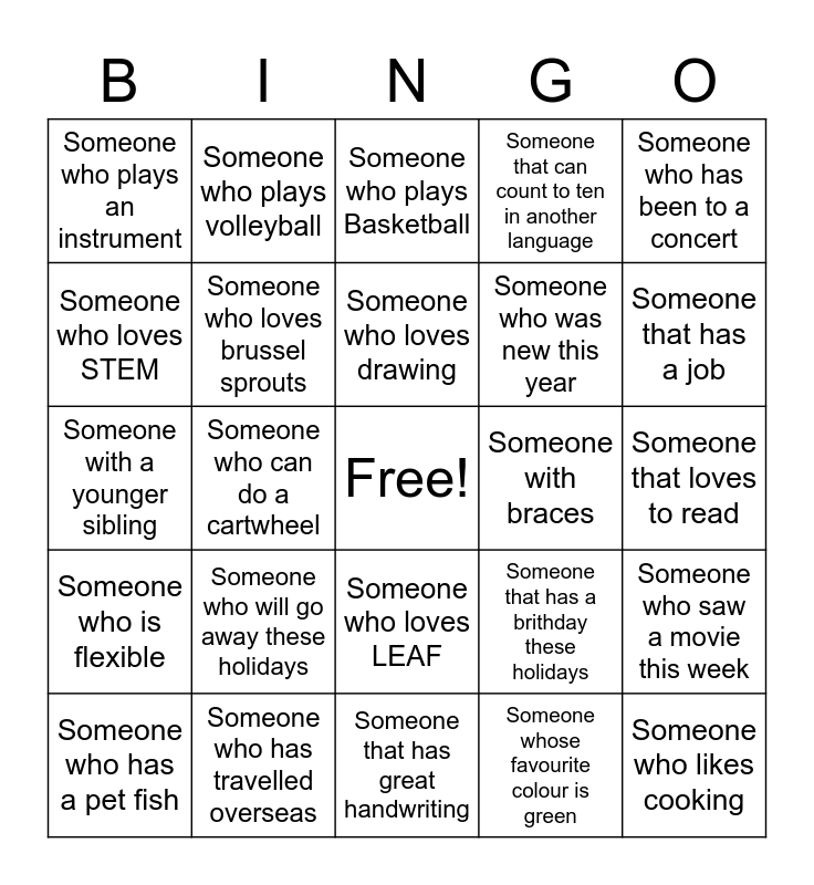 This bingo card has a free space and 24 words: Someone who will go away these holidays, Someone who has travelled overseas, Someone who loves drawing, Someone who has a pet fish, Someone who has been to a concert, Someone who plays an instrument, Someone who loves STEM, Someone who plays volleyball, Someone with braces, Someone who loves LEAF, Someone who was new this year, Someone with a younger sibling, Someone that has a brithday these holidays, Someone who saw a movie this week, Someone who loves brussel sprouts, Someone whose favourite colour is green, Someone that loves to read, Someone who plays Basketball, Someone that has a job, Someone who can do a cartwheel, Someone who likes cooking, Someone who is flexible, Someone that can count to ten in another language and Someone that has great handwriting.