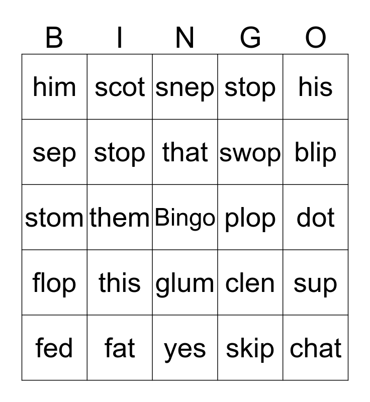 This bingo card has a free space and 24 words: this, fat, that, fed, his, him, sep, scot, plop, glum, swop, stom, clen, sup, stop, skip, dot, snep, blip, them, chat, flop, stop and yes.