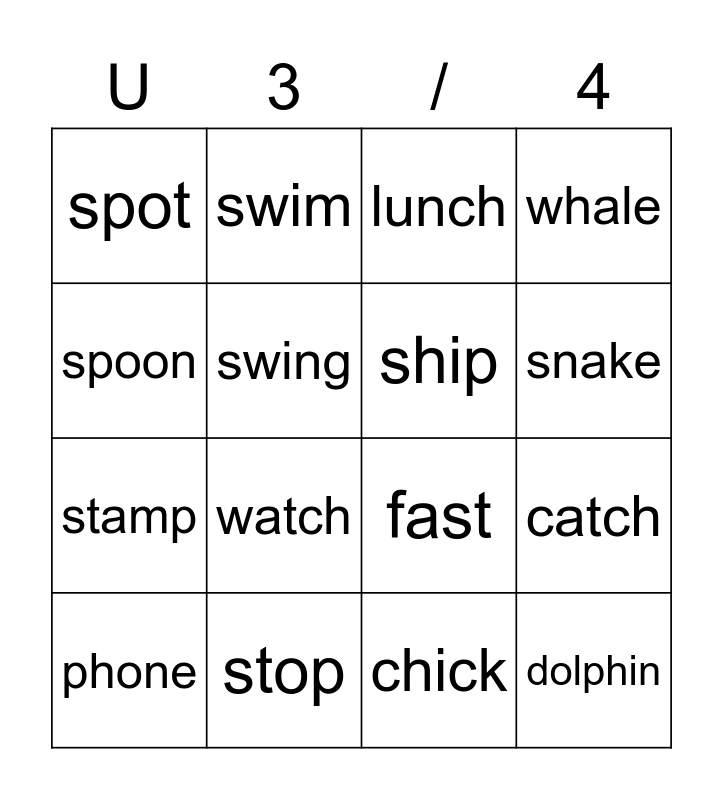 This bingo card has 24 words: smile, smoke, snake, snow, spoon, spot, swing, swim, stop, test, stamp, fast, shell, fish, ship, brush, chick, lunch, watch, catch, phone, dolphin, whale and white.