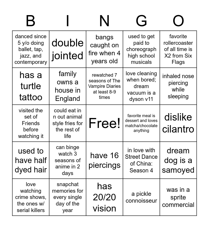 This bingo card has a free space and 30 words: snapchat memories for every single day of the year, almost burned the university apartment down b/c of a candle, could eat in n out animal style fries for the rest of life, working on a personal blog documenting educational progress, danced since 5 y/o doing ballet, tap, jazz, and contemporary, bangs caught on fire when 4 years old, family owns a house in England, have 16 piercings, favorite meal is dessert and loves matcha/chocolate anything, has 20/20 vision, dislike cilantro, was in a sprite commercial, a pickle connoisseur, broke ring finger while playing dodgeball in 5th grade, inhaled nose piercing while sleeping, eat poke/sushi at least once a week, in love with Street Dance of China: Season 4, used to have half dyed hair, can binge watch 3 seasons of anime in 2 days, favorite rollercoaster of all time is X2 from Six Flags, visited the set of Friends before watching it, eat dumplings with ketchup, double jointed, love cleaning when bored; dream vacuum is a dyson v11, has a turtle tattoo, used to get paid to choreograph high school musicals, dream dog is a samoyed, love watching crime shows, the ones w/ serial killers, rewatched 7 seasons of The Vampire Diaries at least 8-9 times and has pet wolves.