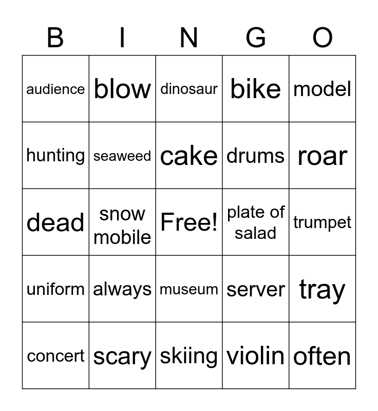 This bingo card has a free space and 29 words: concert, sream, snow mobile, skeleton, audience, dinosaur, seaweed, always, plate of salad, scary, trumpet, often, skiing, violin, roar, raw, museum, uniform, model, dead, server, alive, drums, hunting, bike, blow, tray, cake and key.