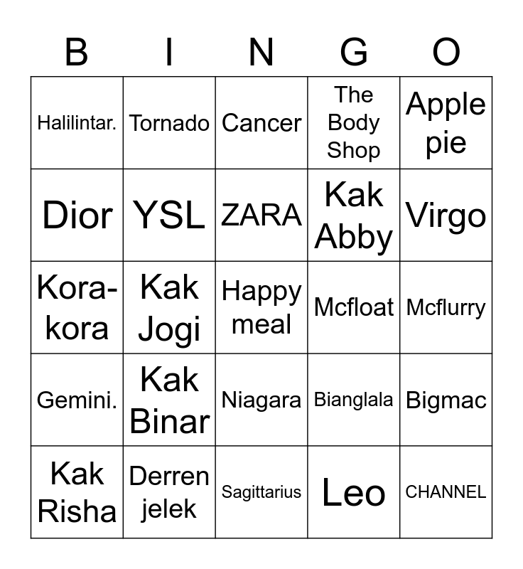 This bingo card has 25 words: Kak Binar, Sagittarius, ZARA, Kak Risha, Apple pie, Halilintar., Dior, Tornado, Mcfloat, Niagara, Kak Abby, Kora-kora, Bianglala, Bigmac, YSL, CHANNEL, Mcflurry, Cancer, Virgo, Kak Jogi, Happy meal, Derren jelek, Gemini., The Body Shop and Leo.