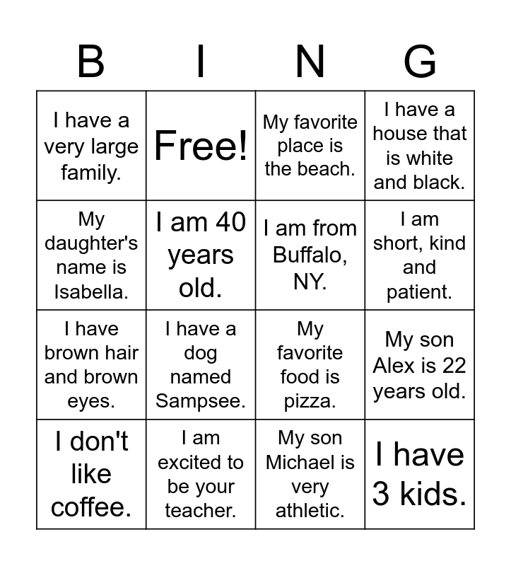 This bingo card has 19 words: My favorite food is pizza., I like to read books., My favorite place is the beach., I have 3 kids., My son Alex is 22 years old., My daughter's name is Isabella., My son Michael is very athletic., I have a very large family., Free!, I have brown hair and brown eyes., I have a dog named Sampsee., I am 40 years old., I am from Buffalo, NY., I am excited to be your teacher., I don't like coffee., I have 2 nephews and one niece., I have a house that is white and black., I am short, kind and patient. and My birthday is February 27th..