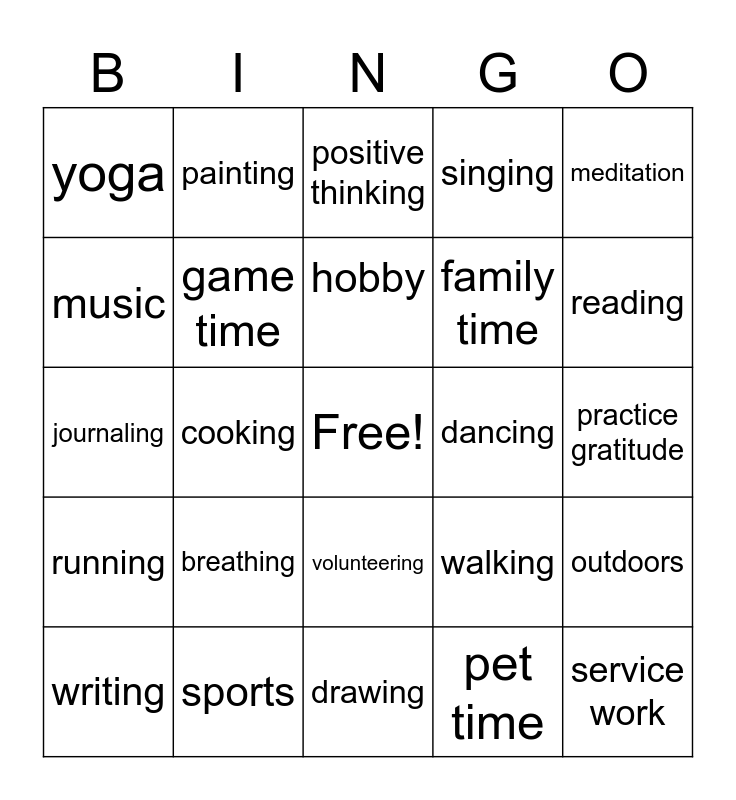 This bingo card has a free space and 24 words: breathing, sports, hobby, writing, meditation, yoga, music, painting, dancing, volunteering, family time, journaling, walking, outdoors, game time, pet time, practice gratitude, positive thinking, reading, cooking, service work, running, singing and drawing.