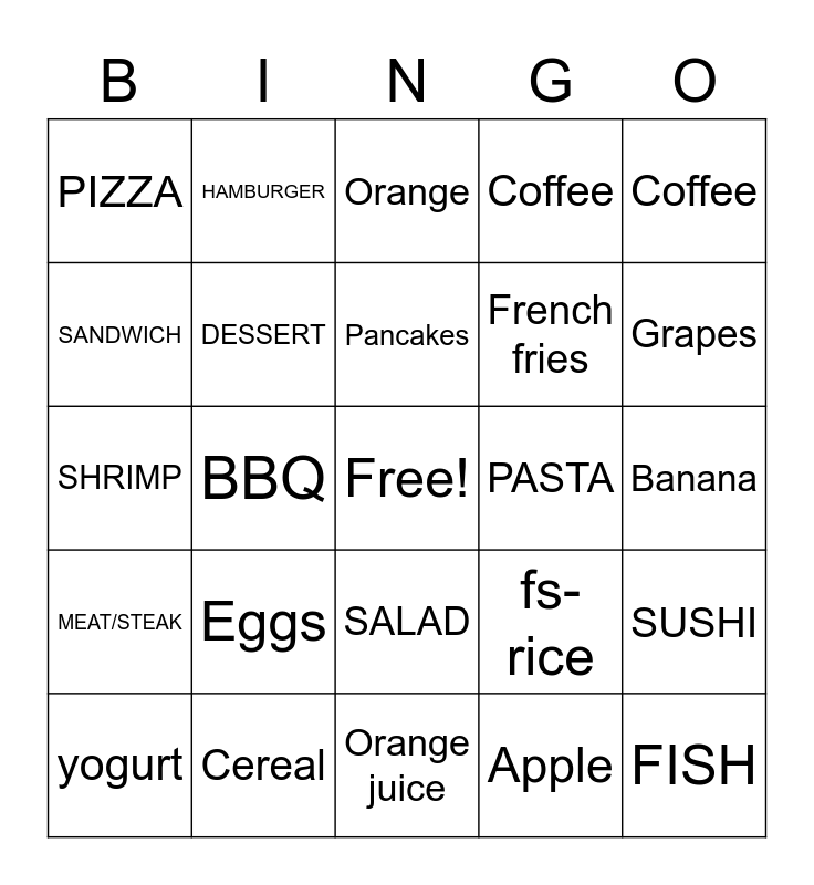 This bingo card has a free space and 24 words: Eggs, Cereal, Pancakes, yogurt, Coffee, PIZZA, SANDWICH, HAMBURGER, PASTA, SALAD, French fries, SHRIMP, fs-rice, SUSHI, DESSERT, Apple, Banana, Orange, Grapes, BBQ, FISH, MEAT/STEAK, Coffee and Orange juice.
