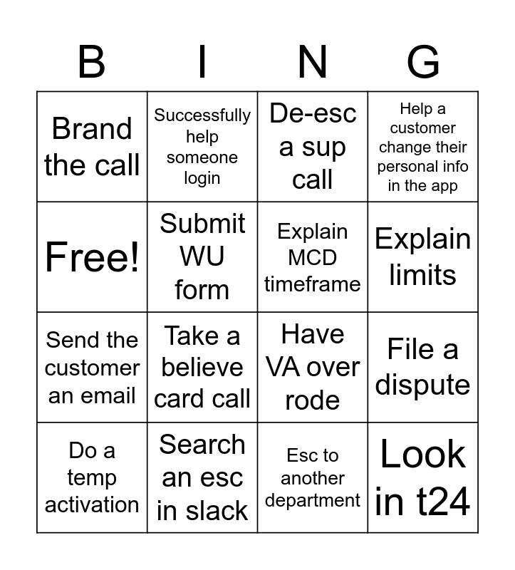 This bingo card has 16 words: Search an esc in slack, File a dispute, De-esc a sup call, Brand the call, Send the customer an email, Successfully help someone login, Have VA over rode, Esc to another department, Free!, Submit WU form, Do a temp activation, Help a customer change their personal info in the app, Take a believe card call, Explain limits, Explain MCD timeframe and Look in t24.