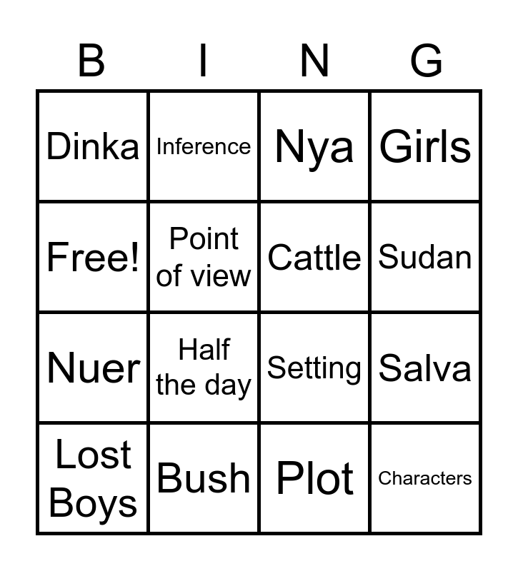 This bingo card has 16 words: Bush, Salva, Nya, Dinka, Nuer, Inference, Setting, Plot, Free!, Point of view, Lost Boys, Girls, Half the day, Sudan, Cattle and Characters.