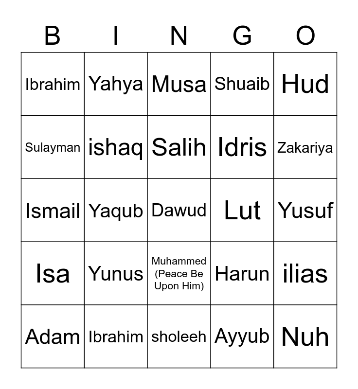 This bingo card has a free space and 24 words: Yunus, Ibrahim, Salih, Adam, Hud, Ibrahim, Sulayman, Yahya, Lut, Muhammed (Peace Be Upon Him), Idris, Ismail, Harun, ilias, ishaq, Ayyub, Yusuf, Musa, Zakariya, Yaqub, Nuh, Isa, Shuaib and sholeeh.