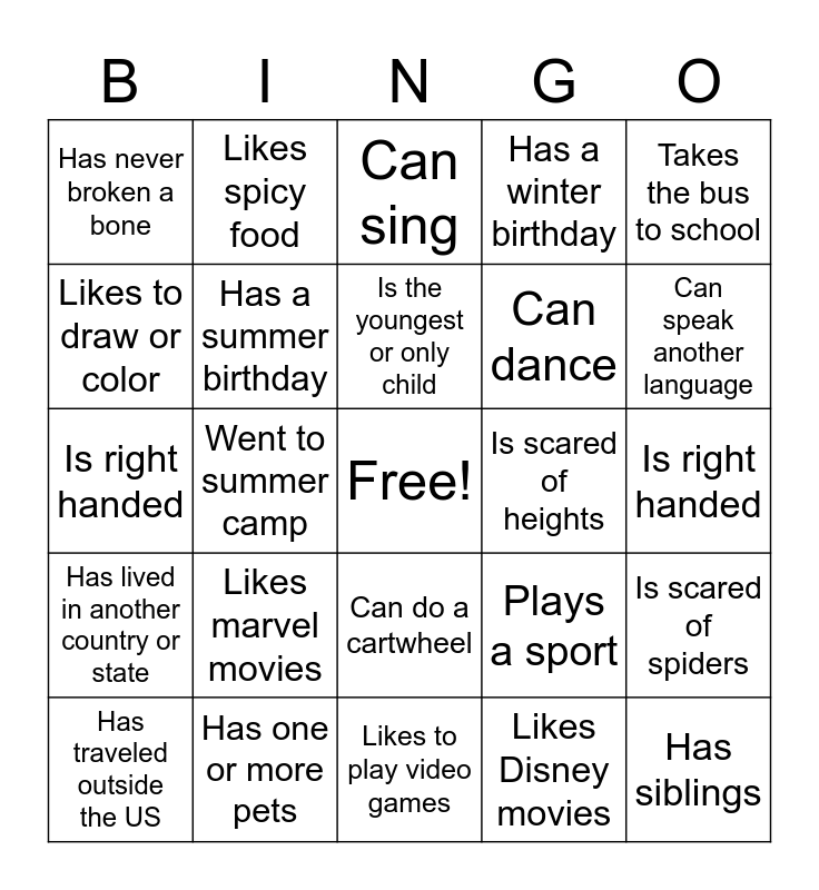 This bingo card has a free space and 24 words: Likes marvel movies, Has one or more pets, Is the youngest or only child, Has traveled outside the US, Takes the bus to school, Has never broken a bone, Likes to draw or color, Likes spicy food, Is scared of heights, Can do a cartwheel, Can dance, Is right handed, Plays a sport, Is scared of spiders, Has a summer birthday, Likes Disney movies, Is right handed, Can sing, Can speak another language, Went to summer camp, Has siblings, Has lived in another country or state, Has a winter birthday and Likes to play video games.