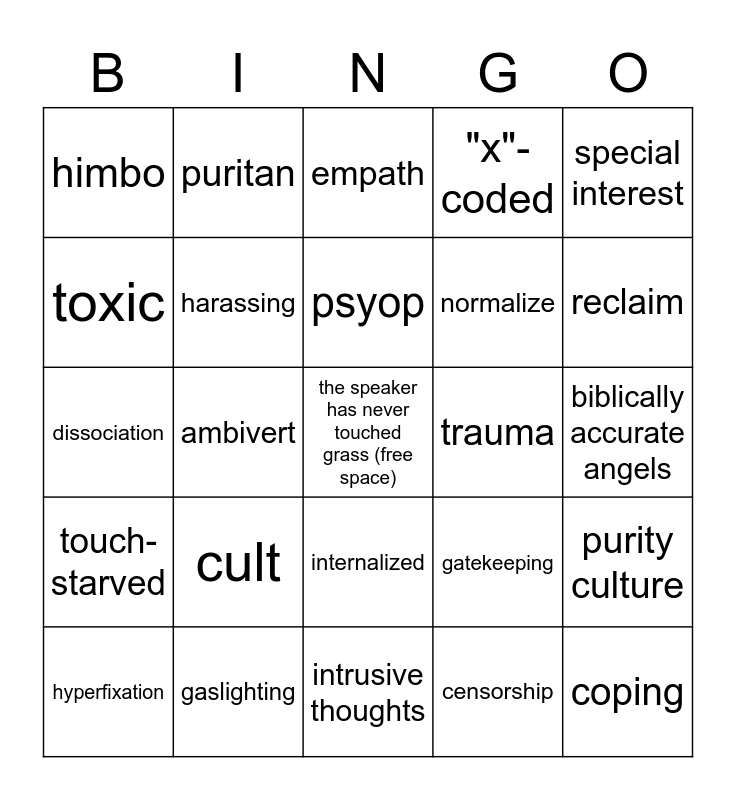 This bingo card has a free space and 24 words: cult, gaslighting, psyop, hyperfixation, special interest, himbo, toxic, puritan, trauma, internalized, normalize, dissociation, gatekeeping, purity culture, harassing, censorship, biblically accurate angels, empath, reclaim, ambivert, coping, touch-starved, "x"-coded and intrusive thoughts.