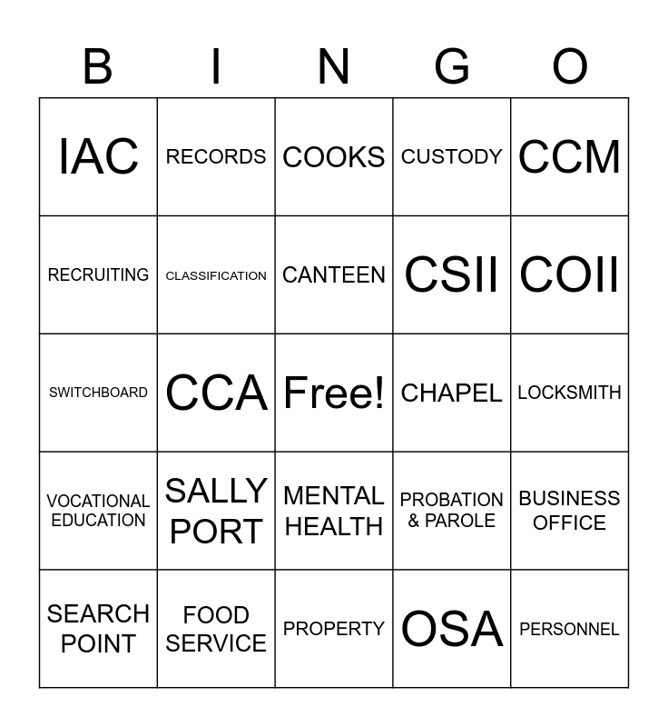 This bingo card has a free space and 50 words: PATCH, PERSONNEL, POWER HOUSE, PROPERTY, SALLY PORT, RECEIVING & ORIENTATION, RECORDS, RECREATION, RECRUITING, ADMINISTRATION, CLASSIFICATION, CUSTODY, BUSINESS OFFICE, PROBATION & PAROLE, ACADEMIC EDUCATION, ARMORY, CANTEEN, CHAPEL, FUM, CCM, CCA, OSA, IAC, CSII, CSI, COIII, COII, COI, COOKS, MENTAL HEALTH, SUBSTANCE ABUSE, CLOTHING ISSUE, EMPLOYEE HEALTH NURSE, FIRE & SAFETY, FOOD SERVICE, GRIEVANCE, INVESTIGATORS, LAUNDRY, LIBRARY, LOCKSMITH, MAILROOM, MAINTENANCE, MEDICAL, MVE FACTORY, SEARCH POINT, SWITCHBOARD, TRAINING CENTER, VISITING, VOCATIONAL EDUCATION and WAREHOUSE.