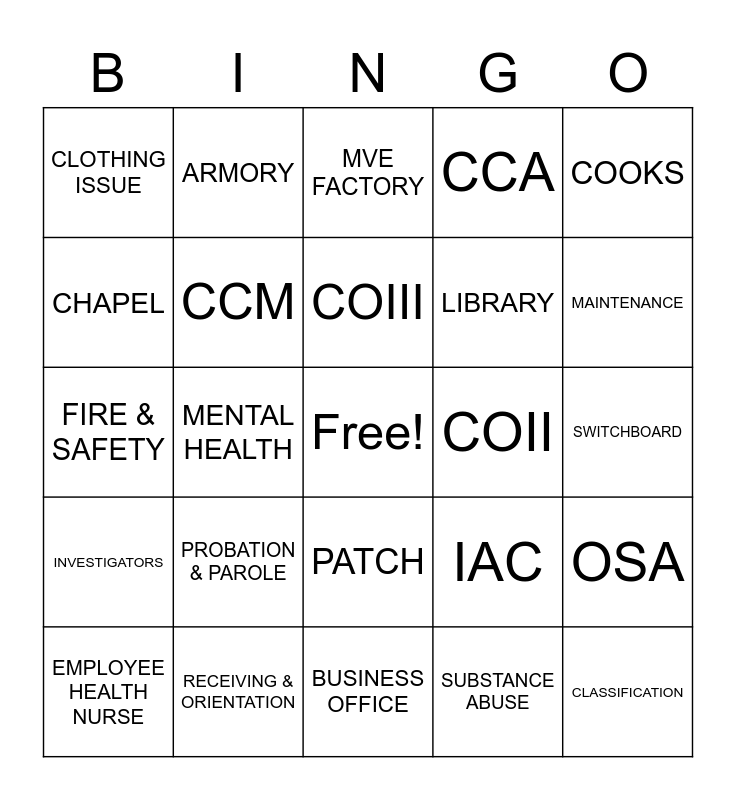 This bingo card has a free space and 50 words: ADMINISTRATION, CLASSIFICATION, CUSTODY, BUSINESS OFFICE, PROBATION & PAROLE, ACADEMIC EDUCATION, ARMORY, CANTEEN, CHAPEL, FUM, CCM, CCA, OSA, IAC, CSII, CSI, COIII, COII, COI, COOKS, MENTAL HEALTH, SUBSTANCE ABUSE, CLOTHING ISSUE, LIBRARY, LOCKSMITH, MAILROOM, MAINTENANCE, MEDICAL, MVE FACTORY, PATCH, PERSONNEL, POWER HOUSE, PROPERTY, SALLY PORT, RECEIVING & ORIENTATION, RECORDS, RECREATION, RECRUITING, SEARCH POINT, SWITCHBOARD, TRAINING CENTER, VISITING, VOCATIONAL EDUCATION, WAREHOUSE, EMPLOYEE HEALTH NURSE, FIRE & SAFETY, FOOD SERVICE, GRIEVANCE, INVESTIGATORS and LAUNDRY.