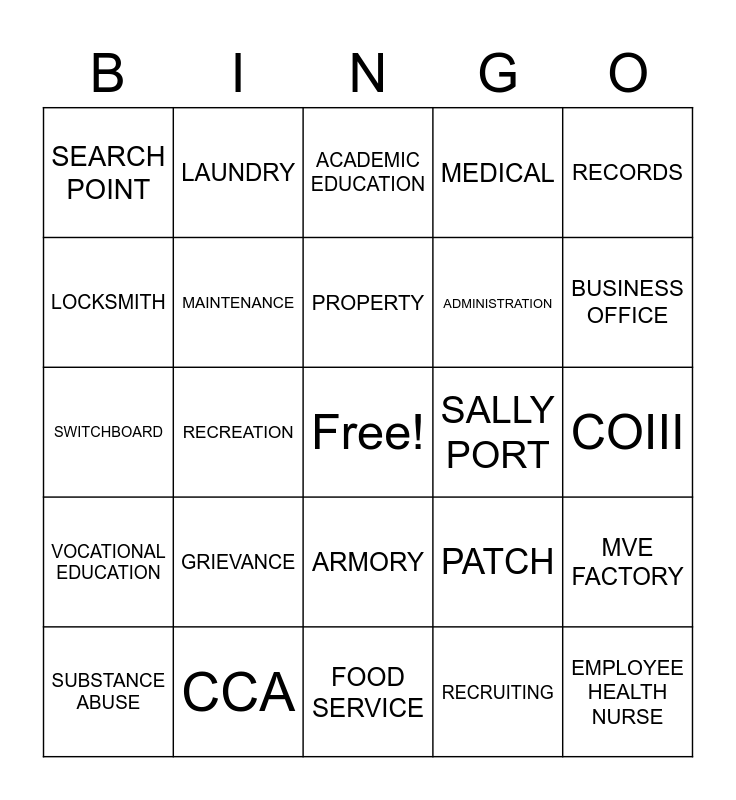 This bingo card has a free space and 50 words: CLOTHING ISSUE, EMPLOYEE HEALTH NURSE, FIRE & SAFETY, FOOD SERVICE, GRIEVANCE, INVESTIGATORS, LAUNDRY, LIBRARY, LOCKSMITH, MAILROOM, MAINTENANCE, MEDICAL, MVE FACTORY, PATCH, PERSONNEL, POWER HOUSE, PROPERTY, SALLY PORT, RECEIVING & ORIENTATION, RECORDS, RECREATION, RECRUITING, SEARCH POINT, ADMINISTRATION, CLASSIFICATION, CUSTODY, BUSINESS OFFICE, PROBATION & PAROLE, ACADEMIC EDUCATION, ARMORY, CANTEEN, CHAPEL, FUM, CCM, CCA, OSA, IAC, CSII, CSI, COIII, COII, COI, COOKS, MENTAL HEALTH, SUBSTANCE ABUSE, SWITCHBOARD, TRAINING CENTER, VISITING, VOCATIONAL EDUCATION and WAREHOUSE.