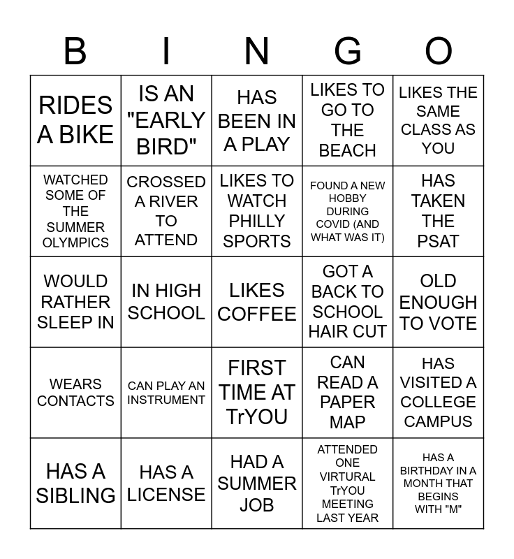 This bingo card has a free space and 29 words: HAS A SIBLING, HAS A PET, IN HIGH SCHOOL, IS LEFT HANDED, RIDES A BIKE, HAS BEEN IN A PLAY, CROSSED A RIVER TO ATTEND, CAN PLAY AN INSTRUMENT, GOT A BACK TO SCHOOL HAIR CUT, HAS A LICENSE, OLD ENOUGH TO VOTE, HAS A BIRTHDAY IN A MONTH THAT BEGINS WITH "M", HAD A SUMMER JOB, ATTENDED ONE VIRTURAL TrYOU MEETING LAST YEAR, HAS TAKEN THE PSAT, HAS GONE SOMEPLACE BY TRAIN, TROLLEY OR SUBWAY, FIRST TIME AT TrYOU, WEARS CONTACTS, LIKES THE SAME CLASS AS YOU, WOULD RATHER SLEEP IN, CAN READ A PAPER MAP, LIKES THE SAME SEASON AS YOU, FOUND A NEW HOBBY DURING COVID (AND WHAT WAS IT), WATCHED SOME OF THE SUMMER OLYMPICS, LIKES TO GO TO THE BEACH, IS AN "EARLY BIRD", HAS VISITED A COLLEGE CAMPUS, LIKES TO WATCH PHILLY SPORTS and CAN RIDE A SKATE BOARD OR ROLLER SKATE.