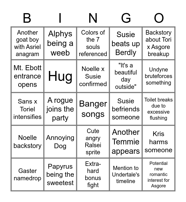 This bingo card has a free space and 24 words: Annoying Dog, Papyrus being the sweetest, Noelle x Susie confirmed, Gaster namedrop, Backstory about Tori x Asgore breakup, Another goat boy with Asriel anagram, Mt. Ebott entrance opens, Alphys being a weeb, Susie befriends someone, Cute angry Ralsei sprite, "It's a beautiful day outside", Sans x Toriel intensifies, Another Temmie appears, Kris harms someone, Hug, Mention to Undertale's timeline, Toilet breaks due to excessive flushing, Colors of the 7 souls referenced, Undyne bruteforces something, A rogue joins the party, Potential new romantic interest for Asgore, Noelle backstory, Susie beats up Berdly and Extra-hard bonus fight.