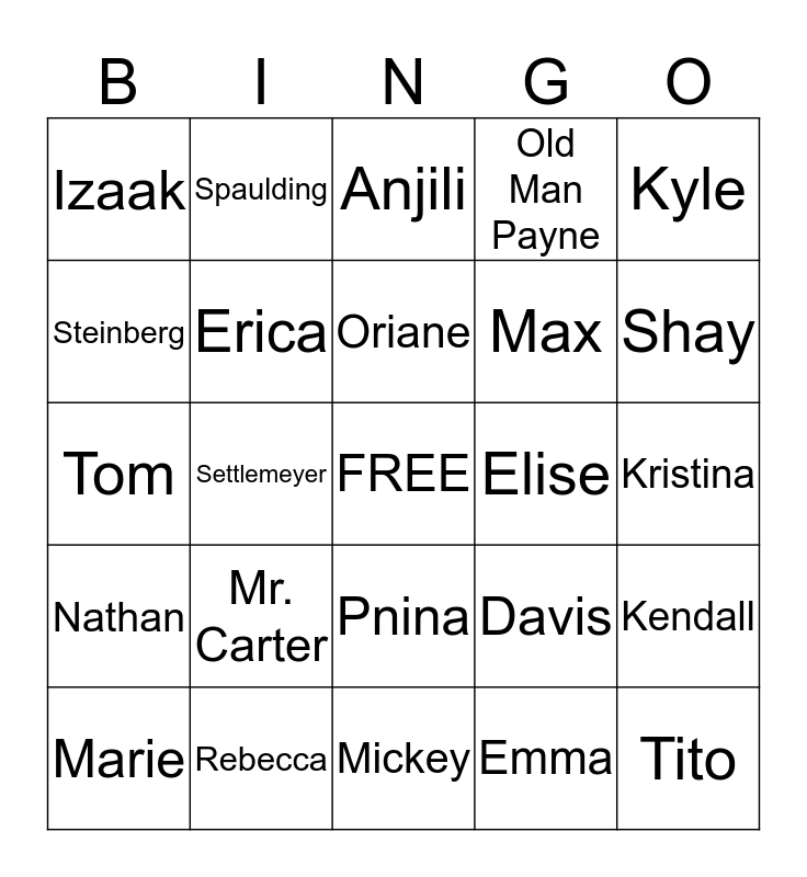 This bingo card has a free space and 24 words: Mr. Carter, Rebecca, Oriane, Marie, Kyle, Izaak, Steinberg, Spaulding, Elise, Pnina, Max, Tom, Davis, Kendall, Erica, Emma, Kristina, Anjili, Shay, Settlemeyer, Tito, Nathan, Old Man Payne and Mickey.