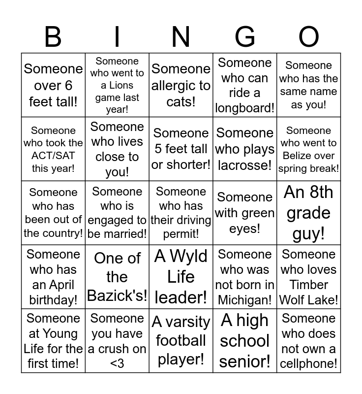 This bingo card has 25 words: One of the Bazick's!, A varsity football player!, Someone 5 feet tall or shorter!, Someone at Young Life for the first time!, Someone who has the same name as you!, Someone over 6 feet tall!, Someone who took the ACT/SAT this year!, Someone who went to a Lions game last year!, Someone with green eyes!, A Wyld Life leader!, Someone who plays lacrosse!, Someone who has been out of the country!, Someone who was not born in Michigan!, Someone who loves Timber Wolf Lake!, Someone who lives close to you!, Someone who does not own a cellphone!, An 8th grade guy!, Someone allergic to cats!, Someone who went to Belize over spring break!, Someone who is engaged to be married!, Someone who has their driving permit!, Someone you have a crush on <3, Someone who has an April birthday!, Someone who can ride a longboard! and A high school senior!.