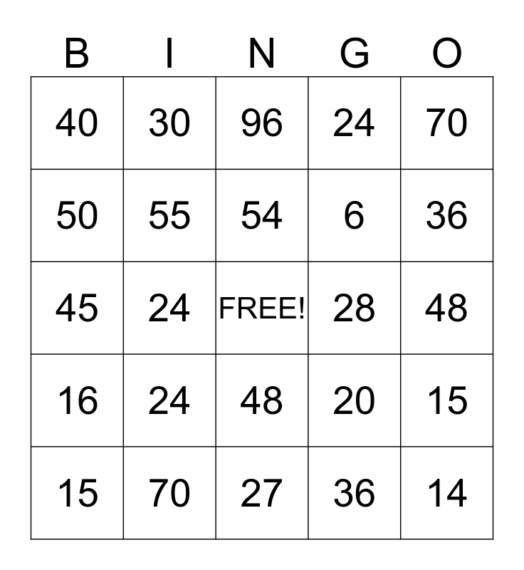 This bingo card has a free space and 25 words: 24, 27, 54, 15, 70, 40, 50, 30, 28, 48, 6, 45, 20, 15, 55, 21, 48, 96, 36, 24, 14, 70, 16, 24 and 36.