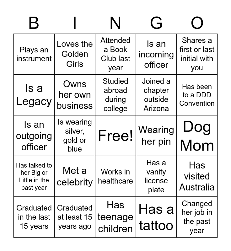 This bingo card has a free space and 27 words: Has a vanity license plate, Joined an Arizona chapter, Joined a chapter outside Arizona, Has teenage children, Is a Legacy, Attended a Book Club last year, Loves the Golden Girls, Has talked to her Big or Little in the past year, Wearing her pin, Has visited Australia, Is an outgoing officer, Is an incoming officer, Graduated in the last 15 years, Graduated at least 15 years ago, Has been to a DDD Convention, Is a snowbird, Owns her own business, Studied abroad during college, Met a celebrity, Plays an instrument, Dog Mom, Has a tattoo, Is wearing silver, gold or blue, Changed her job in the past year, Works in healthcare, Shares a first or last initial with you and Knows our open motto.