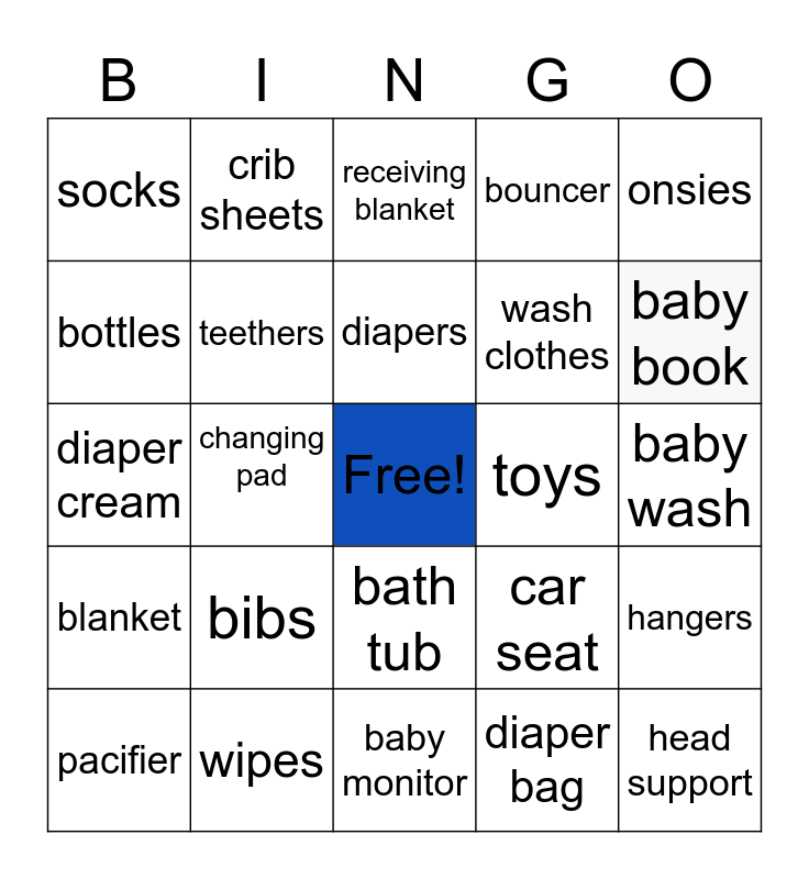 This bingo card has a free space and 24 words: bibs, wipes, diapers, pacifier, onsies, socks, bottles, crib sheets, toys, bath tub, wash clothes, diaper cream, car seat, hangers, teethers, diaper bag, baby wash, receiving blanket, baby book, changing pad, head support, blanket, bouncer and baby monitor.