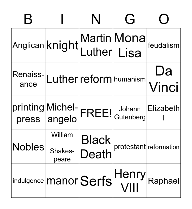 This bingo card has a free space and 24 words: William Shakes- peare, manor, reform, indulgence, feudalism, Anglican, Renaiss-ance, knight, Johann Gutenberg, Black Death, humanism, printing press, protestant, reformation, Luther, Henry VIII, Elizabeth I, Martin Luther, Da Vinci, Michel-angelo, Raphael, Nobles, Mona Lisa and Serfs.
