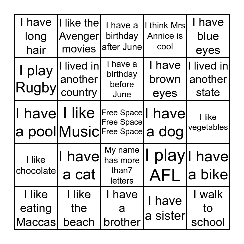 This bingo card has a free space and 24 words: I have a cat, I like the beach, I have a birthday before June, I like eating Maccas, I have blue eyes, I have long hair, I play Rugby, I like the Avenger movies, I have a dog, My name has more than7 letters, I have brown eyes, I have a pool, I play AFL, I have a bike, I lived in another country, I have a sister, I like vegetables, I have a birthday after June, I lived in another state, I like Music, I walk to school, I like chocolate, I think Mrs Annice is cool and I have a brother.